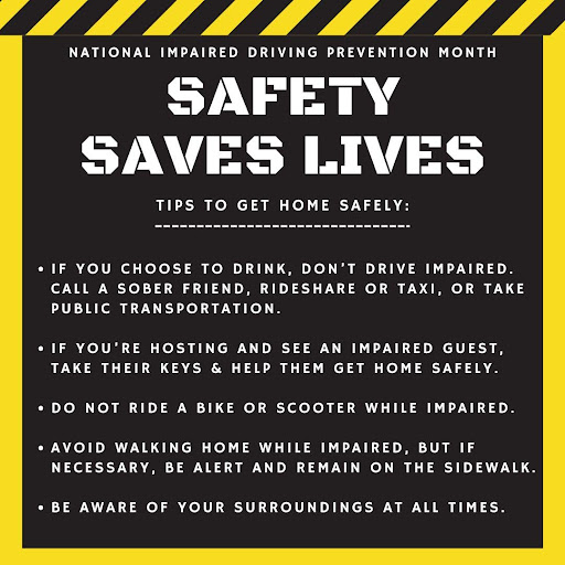 December is National Impaired Driving Prevention Month, which raises awareness about the dangers of impaired driving and implements strategies for people to get home safely. Impaired driving is heightened during the holiday season, and the National Highway Safety Traffic Administration (NHSTA) reports that 13,524 people died in alcohol-impaired driving traffic deaths in 2022.